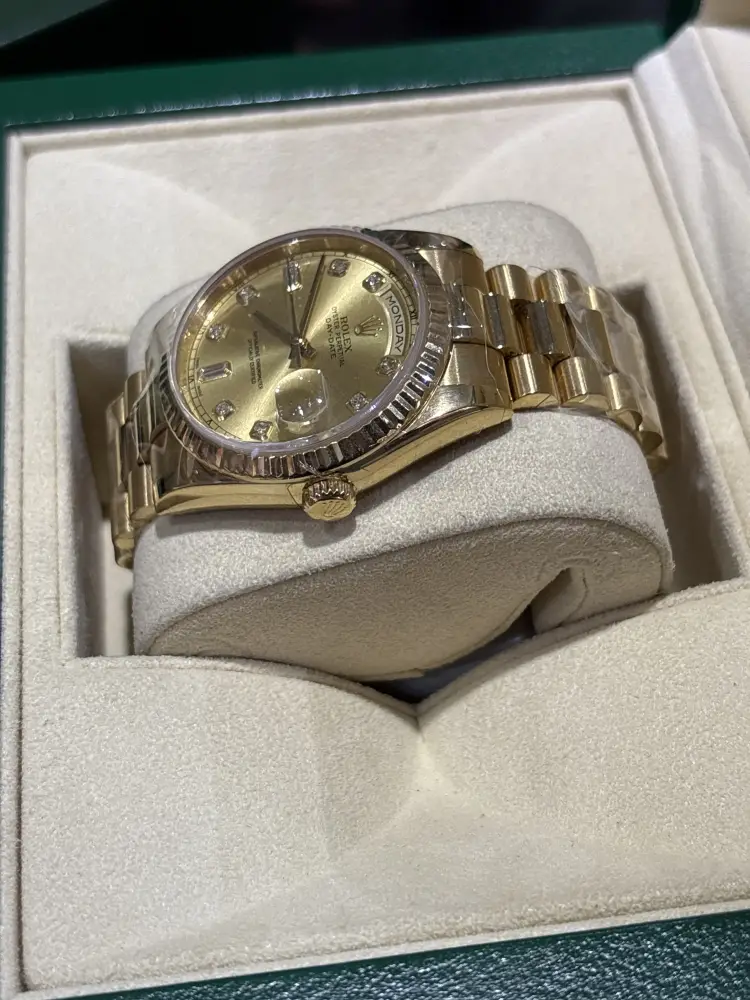 Rolex Day Date 36mm Champagne Dial With Diamonds Marker Fluted Vessel 18k Full Yellow Gold Presidents Braclet 1990